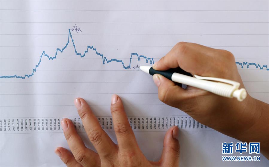 郭旗根據(jù)多年銷售情況,繪制了多寶魚的銷售價格變化圖(9月5日攝)。 新華社記者 楊青 攝