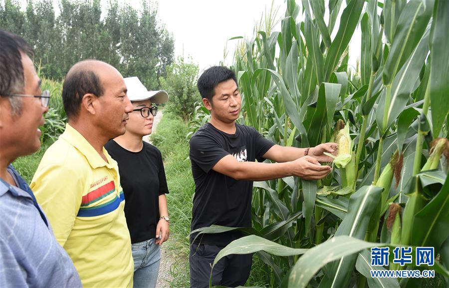 在山東省德州市平原縣的農(nóng)場(chǎng)玉米地里,楊春雷(右一)、卜璐璐(右二)指導(dǎo)當(dāng)?shù)剞r(nóng)戶學(xué)習(xí)有關(guān)科學(xué)種植的知識(shí)(8月22日攝)。  新華社記者 王凱 攝