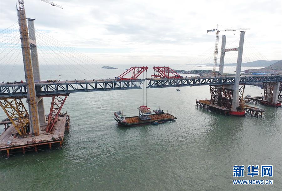 9月21日,平潭海峽公鐵大橋鼓嶼門航道橋的鋼桁梁在吊裝中(無人機(jī)拍攝)。新華社記者林善傳攝