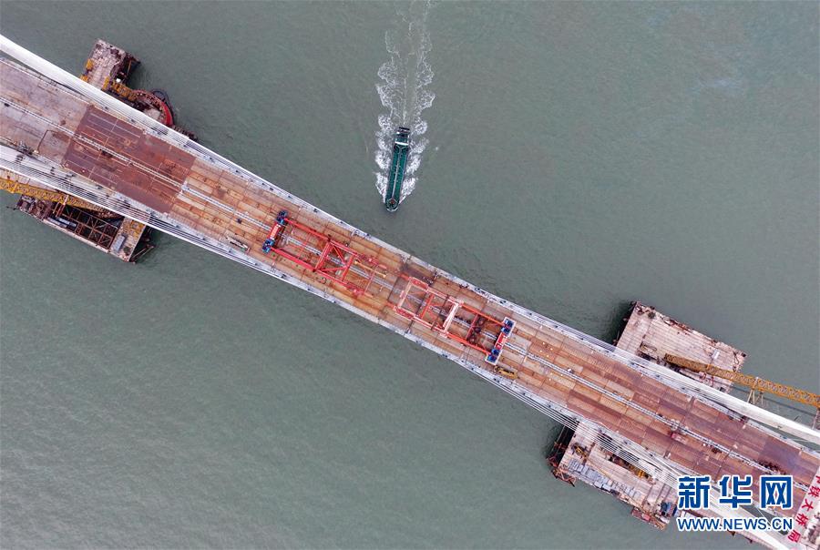 9月21日,平潭海峽公鐵大橋鼓嶼門航道橋的鋼桁梁在吊裝中(無(wú)人機(jī)拍攝)。新華社記者林善傳攝