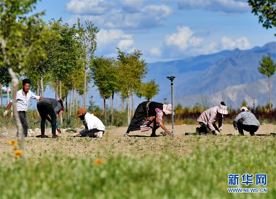 當地群眾在山南市扎囊縣藏草萬畝植物種苗繁育基地勞動(8月29日攝)。 新華社記者 張汝鋒 攝
