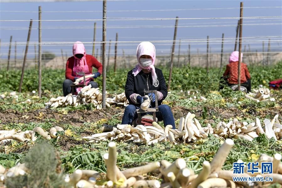 9月30日,寧夏吳忠市紅寺堡區(qū)馬渠生態(tài)移民安置區(qū)的農(nóng)民在將蘿卜切條。 新華社記者 馮開(kāi)華 攝