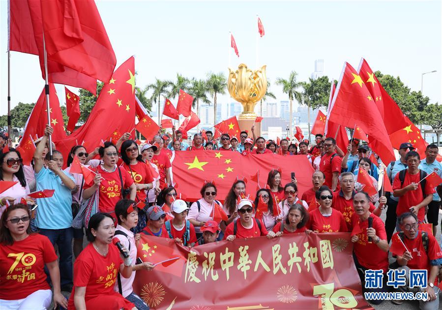 10月1日,香港市民在金紫荊廣場(chǎng)高唱愛(ài)國(guó)歌曲。當(dāng)日是國(guó)慶節(jié),全國(guó)各地的人們用各種方式歡度節(jié)日。新華社記者 吳曉初 攝