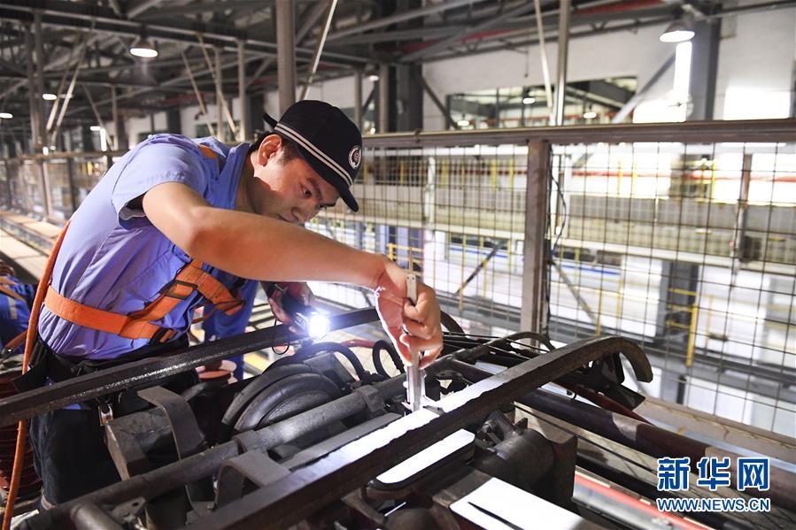 “動車醫(yī)生”們在南寧動車所檢查庫內(nèi)忙碌(10月2日攝)。 新華社記者 曹祎銘 攝