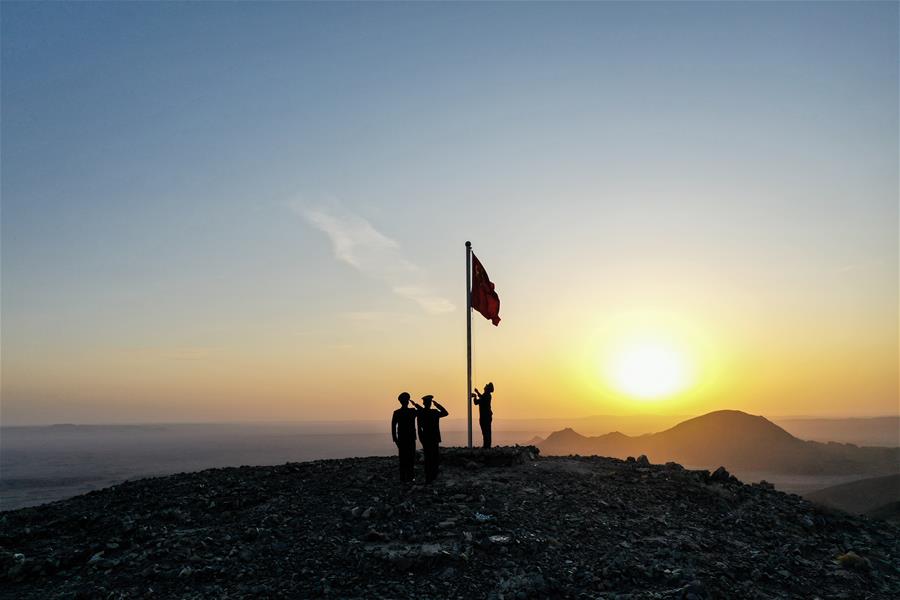 9月27日,內(nèi)蒙古自治區(qū)額濟納旗算井子邊境派出所民警在大紅山上舉行升國旗儀式。新華社記者劉磊攝