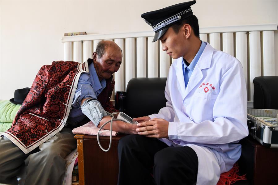 9月25日,內(nèi)蒙古自治區(qū)額濟納旗算井子邊境派出所的衛(wèi)生員陳亞偉(右)給牧民黨德爾進行體檢。新華社記者劉磊攝