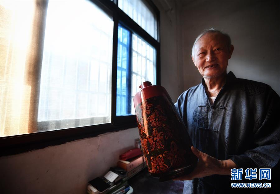 10月12日,丁國(guó)坤在家中展示他最喜歡的一件脫胎漆器作品《花非花》。新華社記者胡晨歡攝