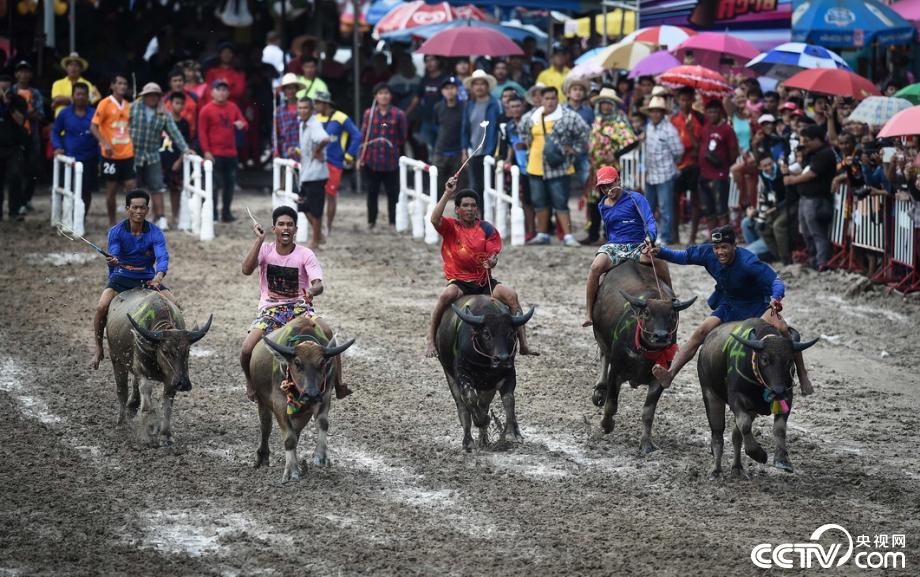 央視網(wǎng)消息:當?shù)貢r間2019年10月12日,泰國春武里舉行一年一度的水牛賽跑,選手騎??癖?。視覺中國