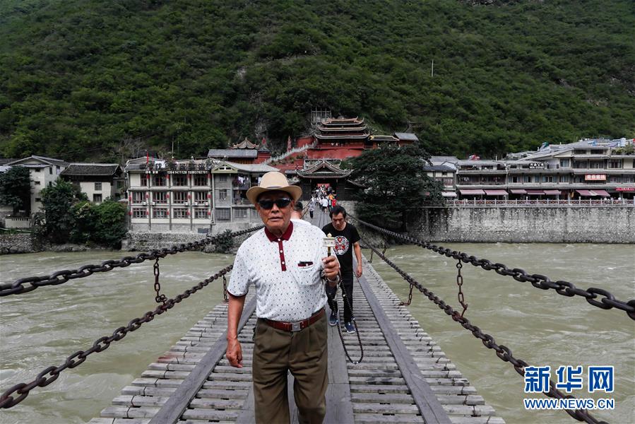 一位當(dāng)?shù)夭刈謇先私?jīng)過(guò)瀘定橋(6月27日攝)。 新華社記者 江宏景 攝