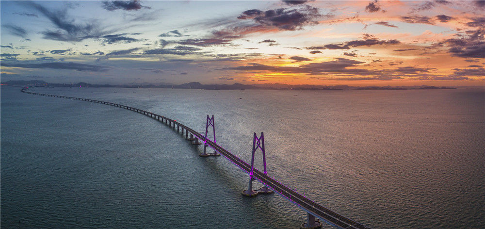 2018年10月22日早晨,從廣東珠海市的情侶路向東眺望,一輪紅日從東方冉冉升起,將港珠澳大橋映射得格外迷人?!俺?jí)工程”港珠澳大橋?qū)⒂?4日上午9時(shí)正式通車。張煒(香港分社)/中新社/視覺中國