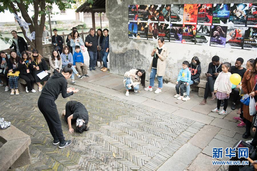 10月26日,一個劇團(tuán)在烏鎮(zhèn)街頭表演戲劇。 新華社記者翁忻旸攝