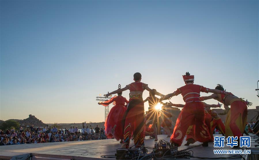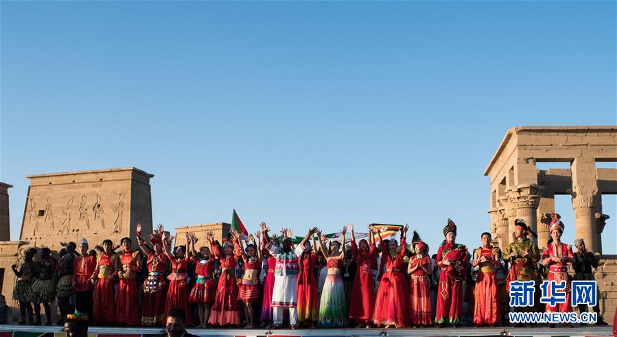 10月27日,來(lái)自福建省廈門市的小白鷺民間舞團(tuán)的演員在位于埃及阿斯旺的菲萊神廟表演。 新華社記者 鄔惠我 攝