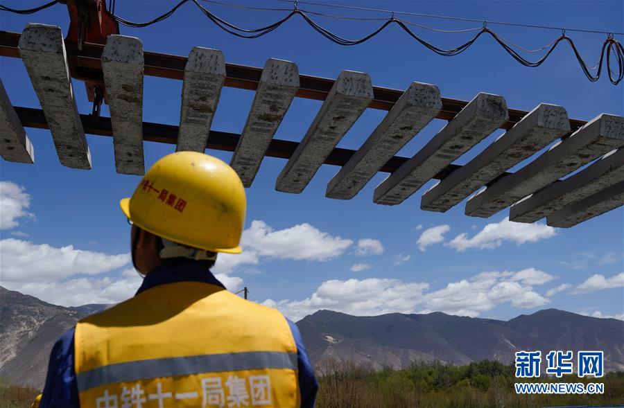 6月6日,負責鋪軌的中鐵十一局集團的建設(shè)者在現(xiàn)場作業(yè)。新華社記者普布扎西攝