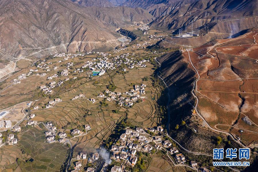 10月29日,俯瞰四川省鄉(xiāng)城縣的定曲河峽谷的青德鄉(xiāng),白色藏房點綴在田園之中(無人機拍攝)。新華社記者江宏景攝