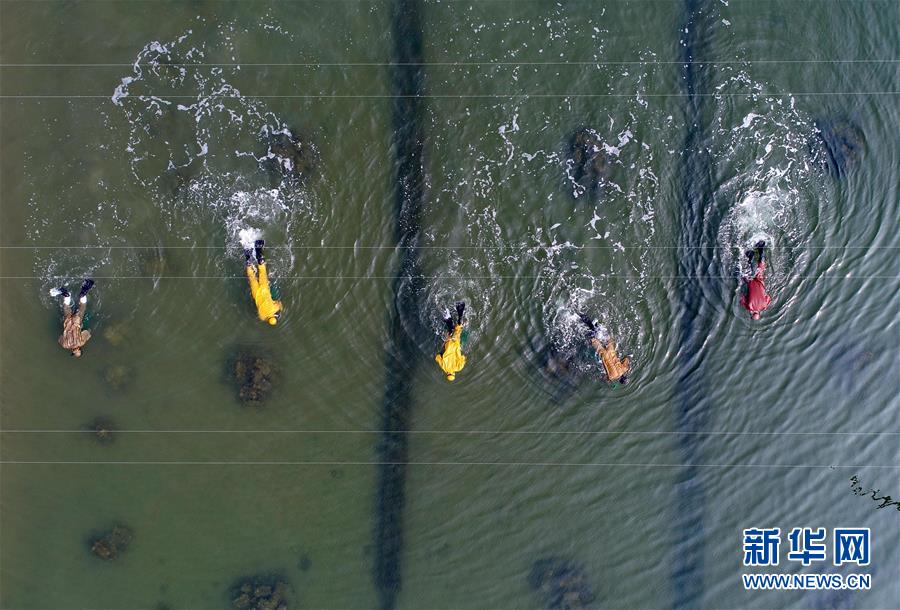 樂(lè)亭縣姜各莊鎮(zhèn)一處海參養(yǎng)殖基地的工人在捕撈海參(10月30日無(wú)人機(jī)拍攝)。