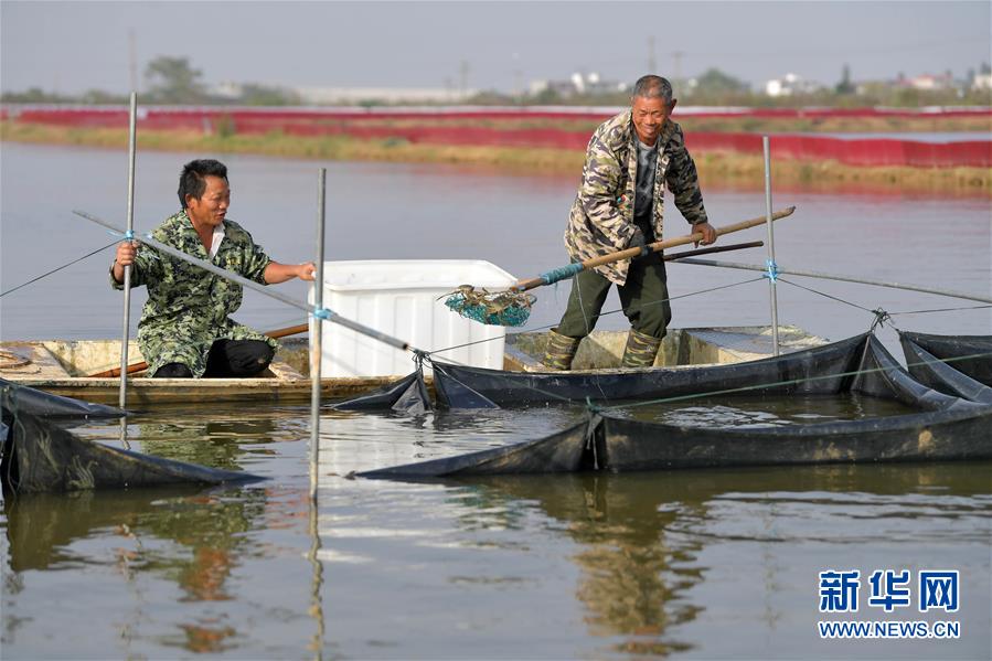 江西省南昌市新建區(qū)象山鎮(zhèn)河林村農(nóng)戶正在大閘蟹養(yǎng)殖基地進行捕撈(10月29日攝)。  新華社記者 彭昭之 攝