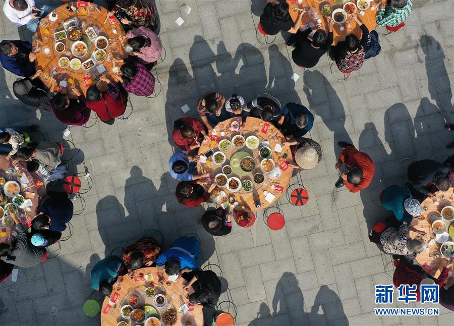 11月2日,南京仙林街道仙林新村社區(qū)居民參加千家宴(無(wú)人機(jī)拍攝)。11月2日至3日,江蘇南京仙林街道仙林新村社區(qū)舉辦“一家親”千家宴活動(dòng)。在社區(qū)精心準(zhǔn)備的基礎(chǔ)上,居民們帶上自己的拿手菜,歡聚一堂,其樂(lè)融融。仙林新村是一處拆遷安置房小區(qū),多年來(lái),社區(qū)通過(guò)網(wǎng)格化管理等方式,鼓勵(lì)和引導(dǎo)居民開展自治,形成了良好的社區(qū)鄰里關(guān)系。  新華社記者 季春鵬 攝
