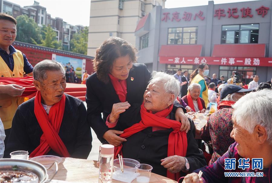 11月2日,南京仙林街道黨工委書記孫金娣(前左二)在千家宴上給老人們戴上圍巾,送上祝福。  新華社記者 季春鵬 攝