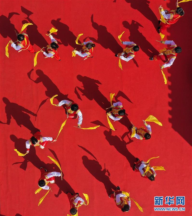 11月2日,南京仙林街道仙林新村社區(qū)居民腰鼓隊(duì)在千家宴上表演助興(無(wú)人機(jī)拍攝)。  新華社記者 季春鵬 攝