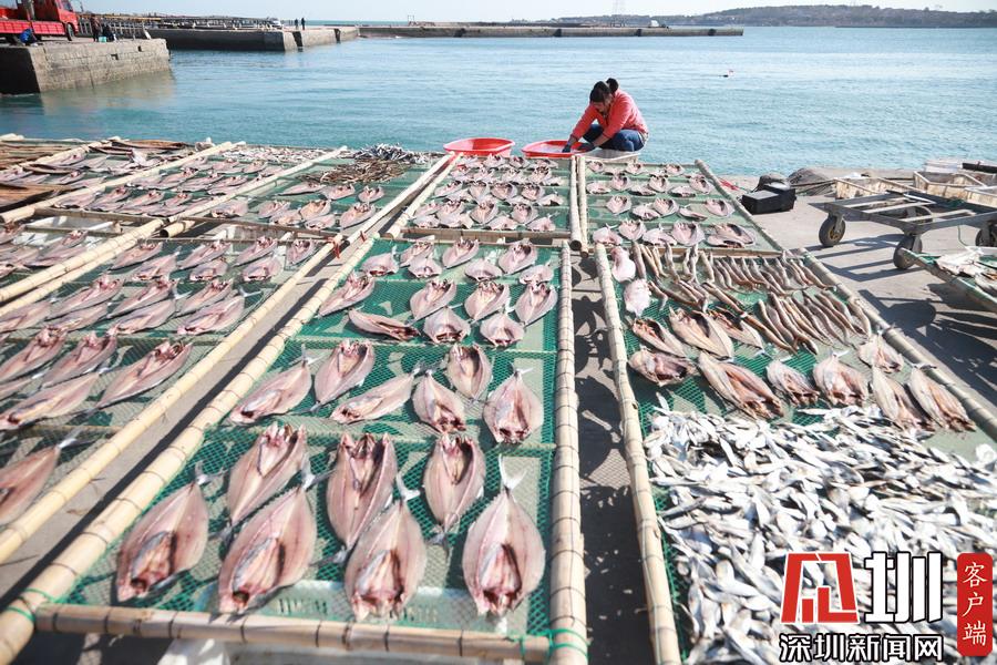 漁民在山東省青島西海岸新區(qū)瑯琊鎮(zhèn)瑯琊港碼頭上晾曬海魚。