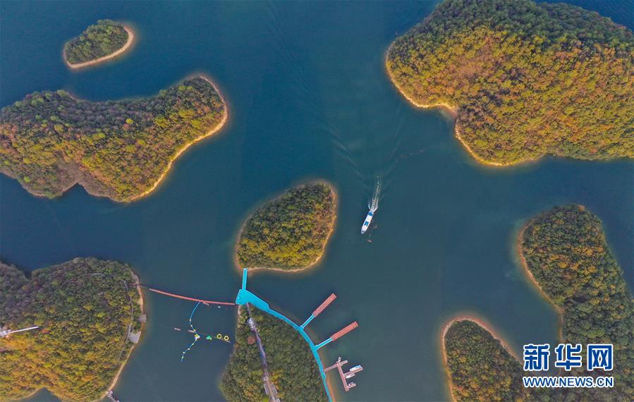11月9日無人機拍攝的廬山西海。 當(dāng)日,落日余暉下的江西廬山西海山青水藍,美不勝收。 新華社記者 周密 攝