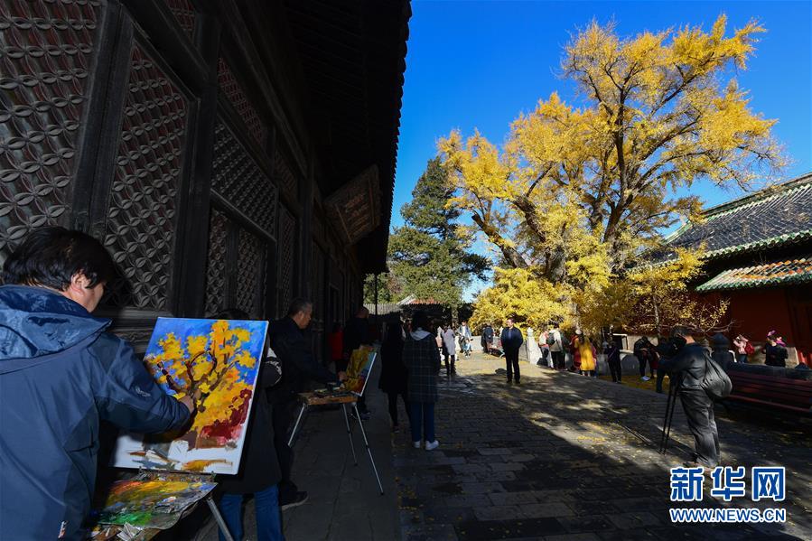 11月11日,繪畫愛好者在大覺寺內(nèi)的古銀杏樹旁寫生。新華社記者尹棟遜攝