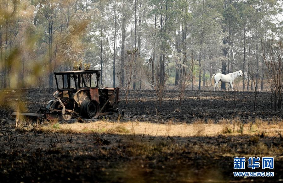 11月11日,在澳大利亞新南威爾士州麥夸里港附近,一匹白馬在山火燒過(guò)的土地上踱步。新華社記者白雪飛攝
