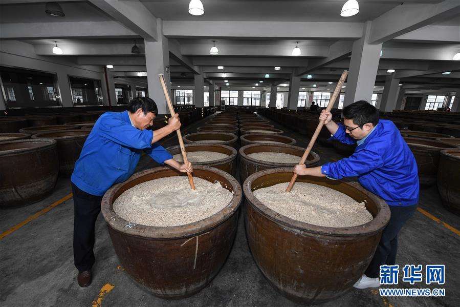 11月7日,古越龍山紹興酒股份有限公司釀酒一廠的工人進(jìn)行“開耙”攪拌。新華社記者徐昱攝