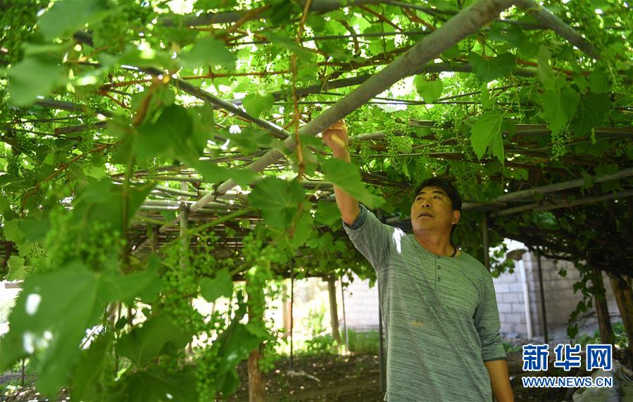 建廠生產(chǎn)并注冊“丁德良”牌干紅葡萄酒品牌的魯仁弟介紹他家里一棵樹齡超過百年的葡萄樹(6月3日攝)。新華社記者晉美多吉攝