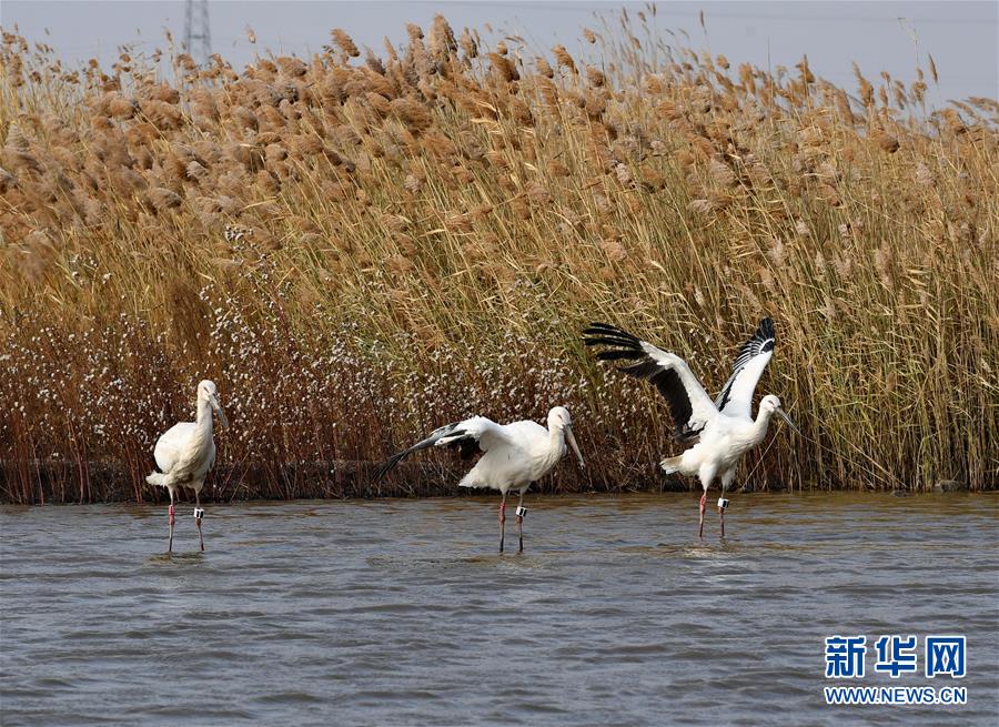 這是在樂(lè)亭縣野生動(dòng)物保護(hù)協(xié)會(huì)大清河鳥(niǎo)類(lèi)救助站放飛回歸大自然的三只國(guó)家一級(jí)保護(hù)動(dòng)物東方白鸛(11月16日攝)。新華社記者楊世堯攝