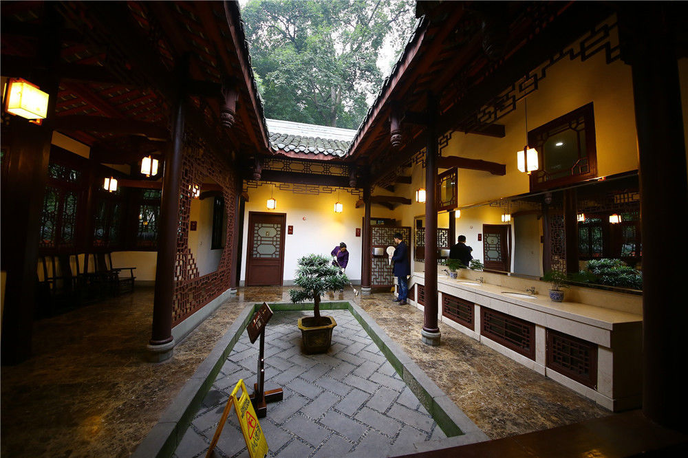 2017年01月03日,四川成都,在成都杜甫草堂景區(qū),現(xiàn)古建筑風(fēng)格式廁所。據(jù)悉,廁所內(nèi)部設(shè)有母嬰室、飲水設(shè)備、公共電話、行李寄存柜,采用古建筑風(fēng)格,為清一色的川西特色四合院。CYBS/視覺中國