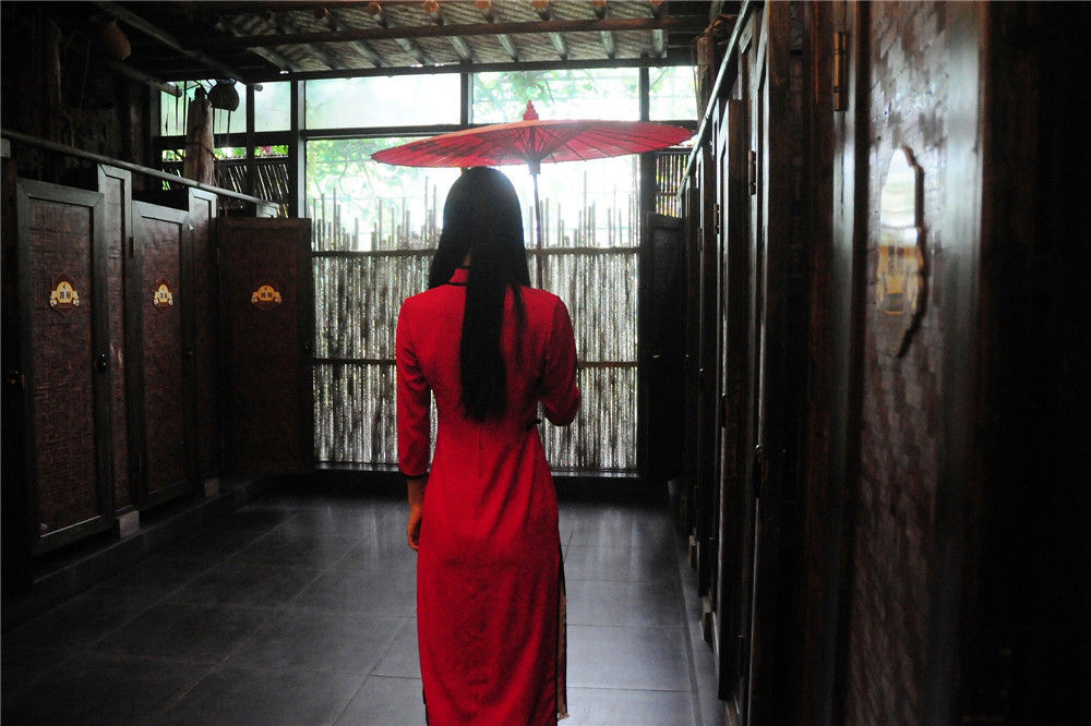 2016年09月29日,杭州,在女廁所,里面也是機關(guān)重重,讓許多游客不敢進(jìn)去,里面還有人扮演紅衣女鬼,撐著紅傘時不時在廁所里面走動,或者你上廁所的時候突然給你遞紙巾。益鵬/視覺中國