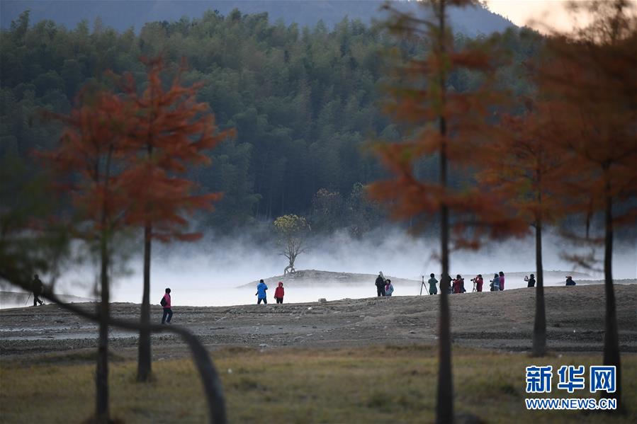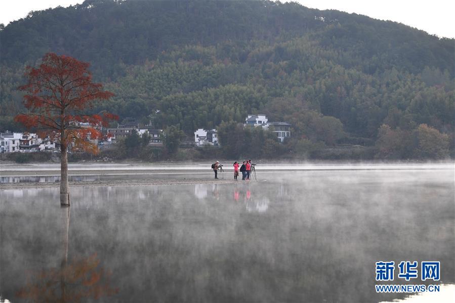 11月14日,游客在奇墅湖邊拍攝風(fēng)光。 初冬時節(jié),安徽省黃山市黟縣奇墅湖晨霧縹緲,別具韻味。新華社記者劉軍喜攝