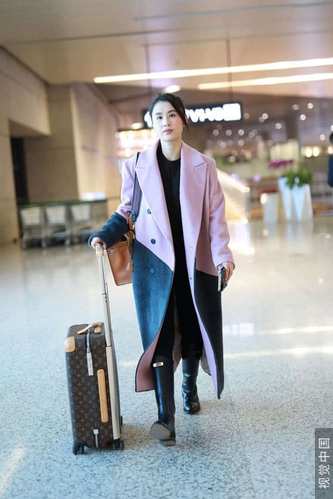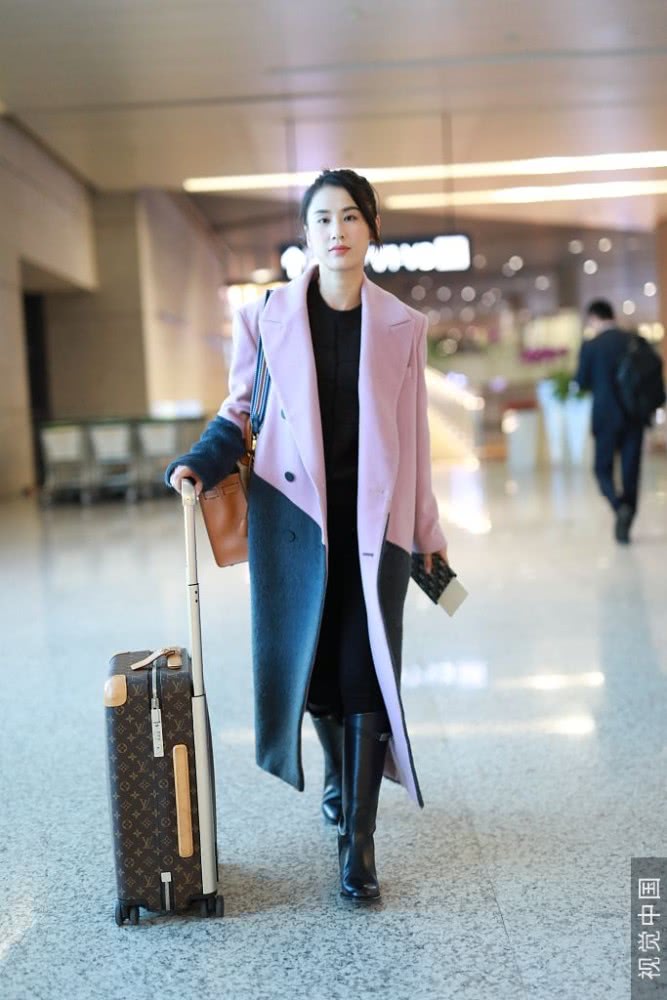 她穿大衣皮靴推行李箱滿滿商務范,扎小辮子五官清麗氣質(zhì)優(yōu)雅。