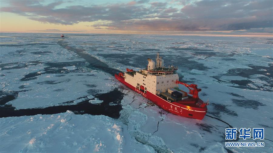 航行在南極圈內(nèi)浮冰區(qū)的“雪龍2”號(hào)和“雪龍”號(hào)(11月19日無人機(jī)拍攝)。新華社記者劉詩平攝