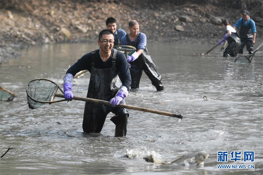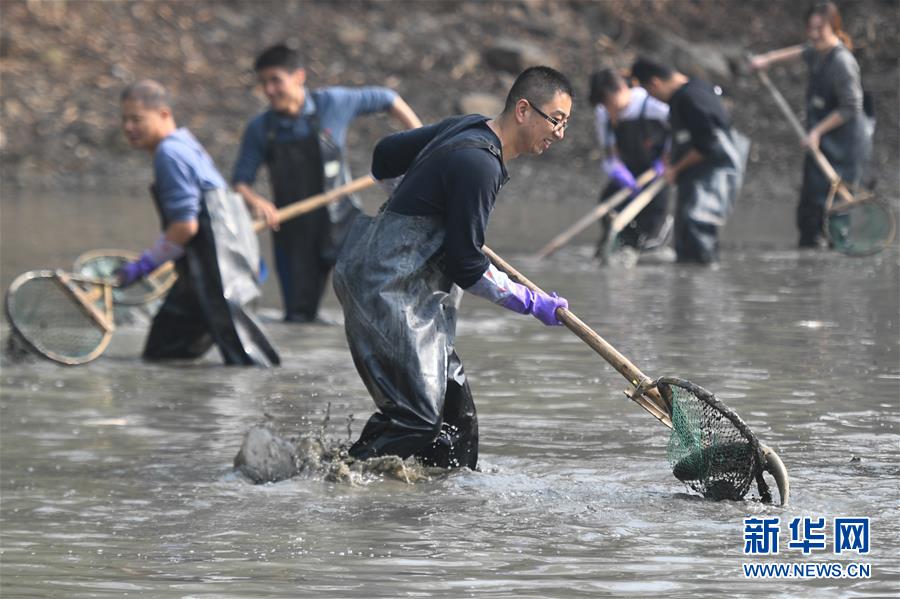11月24日,游客在西溪濕地體驗“干塘”捕魚。新華社記者黃宗治攝