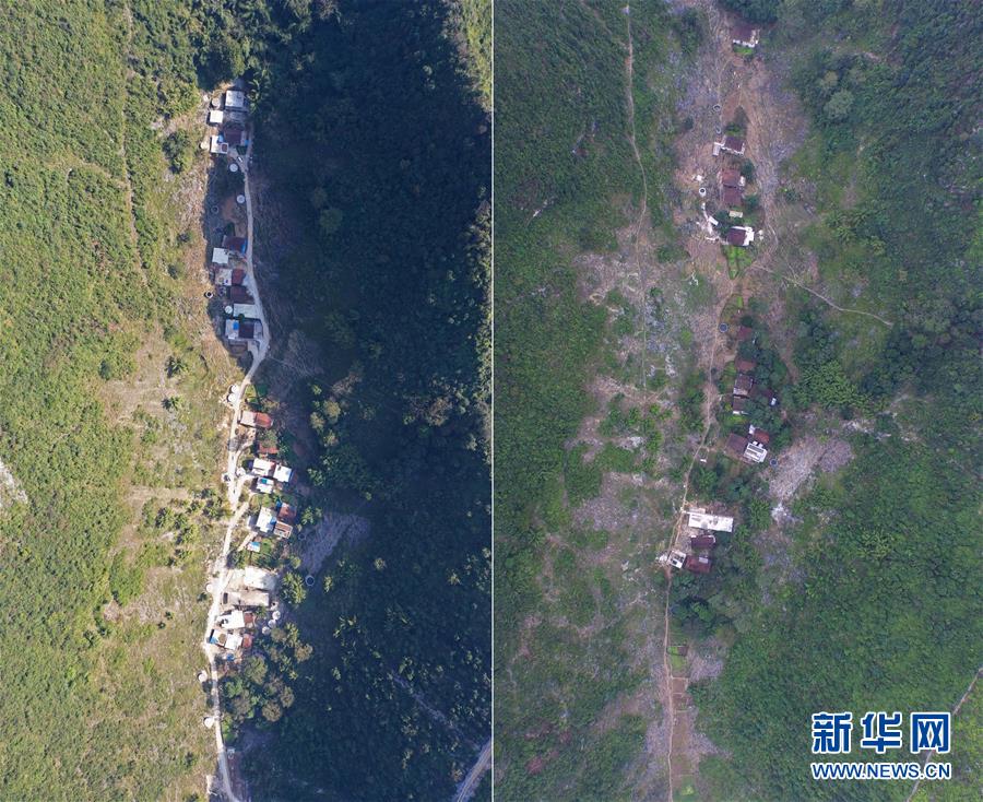 拼版照片:左圖為剛剛修通水泥路的大化瑤族自治縣板升鄉(xiāng)八好村弄研屯(11月11日無人機(jī)拍攝);右圖為尚未通路的八好村弄研屯(2015年11月3日無人機(jī)拍攝)。新華社記者黃孝邦攝