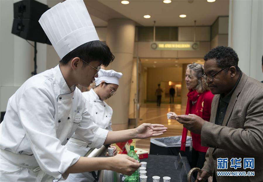 11月22日,在美國(guó)華盛頓,人們?cè)凇氨本┤铡蔽幕瘡R會(huì)活動(dòng)上品嘗中國(guó)小吃。作為中國(guó)北京和美國(guó)首都華盛頓締結(jié)友好城市35周年慶?;顒?dòng)的一部分,“北京日”文化廟會(huì)22日在華盛頓羅納德·里根大廈和國(guó)際貿(mào)易中心舉行。新華社記者劉杰攝