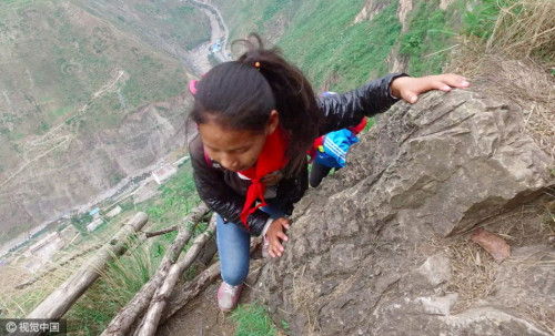 村里通向外界,需要順著懸崖斷續(xù)攀爬17條藤梯,其中接近村莊的幾乎垂直的兩條相連的藤梯長度約100米,沒有藤梯的崖壁才是最危險的。據(jù)支爾莫鄉(xiāng)黨委書記阿皮幾體講,他知道的在這條路上摔死的人有七八個,有村里的人,也有外來的人,而摔傷的人更多。圖片來源:視覺中國
