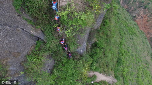 4月27日,阿土勒爾村的一個(gè)村民摔下了懸崖,村子里的大人對(duì)在山下讀書(shū)的孩子更加擔(dān)心起來(lái)。阿土勒爾村有15個(gè)6至15歲的孩子在山腳下的勒爾小學(xué)上學(xué),平時(shí)住校,每月月中和月底的周末才回家。每次上下山,家長(zhǎng)們都會(huì)輪流接送。圖片來(lái)源:視覺(jué)中國(guó)
