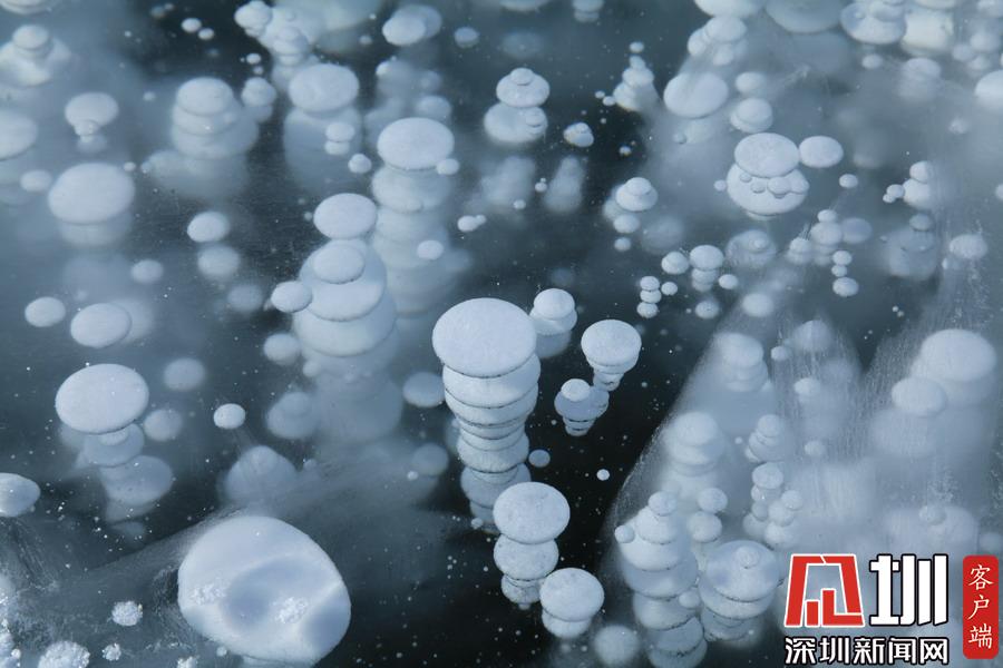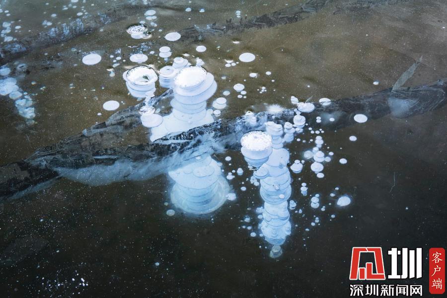 透過(guò)晶瑩剔透的冰面,可以看到一串串潔白氣泡分布在冰層中。