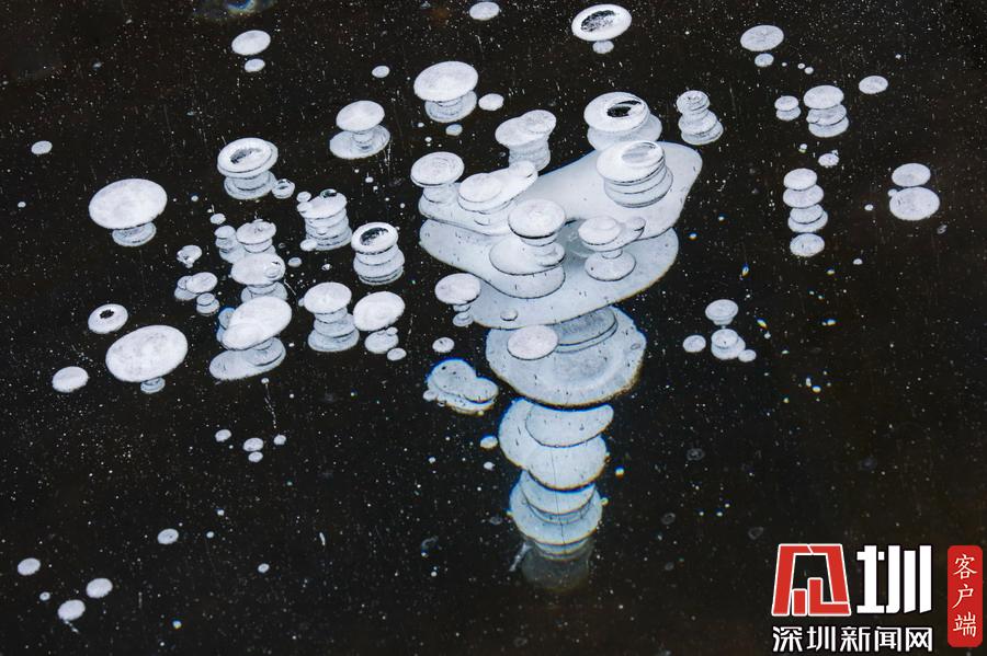 地處漠河市觀音山景區(qū)的蓮花湖湖面已經(jīng)完全封凍,冰層最厚的地方已經(jīng)超過(guò)60厘米,透過(guò)晶瑩剔透的冰面可以看到一串串潔白的氣泡分布在冰層之中,形成一組組惟妙惟肖的“冰泡”奇觀。
