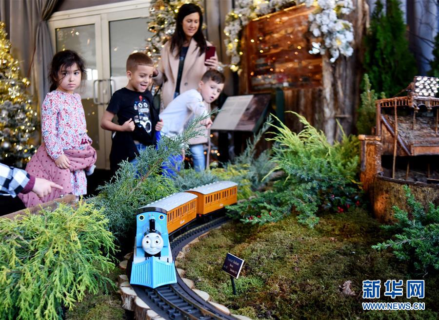 11月26日,在美國紐約植物園節(jié)日小火車展上,兒童觀看托馬斯模型小火車。新華社記者韓芳攝