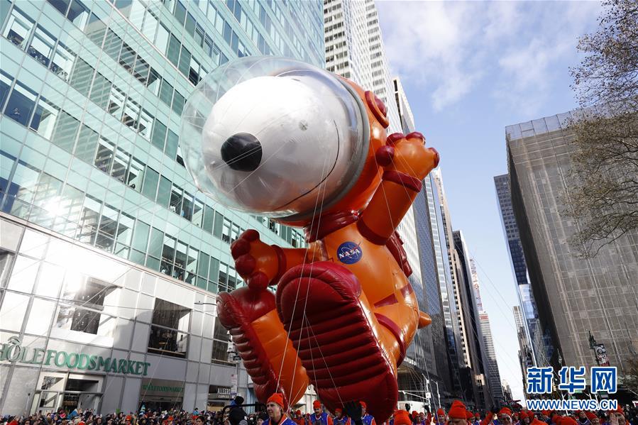 11月28日,在美國紐約舉行的感恩節(jié)大游行上,卡通氣球行進(jìn)在曼哈頓街頭。 新華社記者 李木子 攝