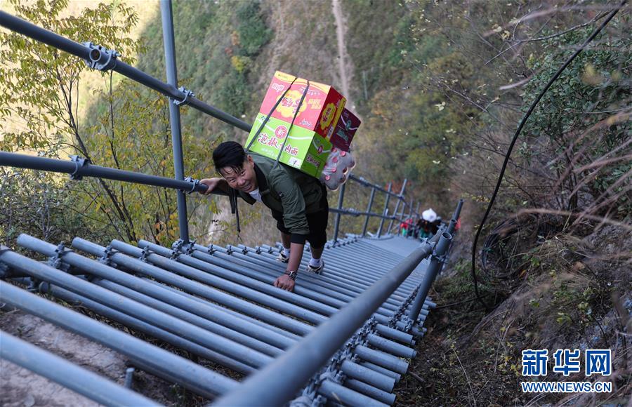 阿土列爾村彝族小伙俄底格哈背著食物攀爬鋼梯(11月24日攝)。