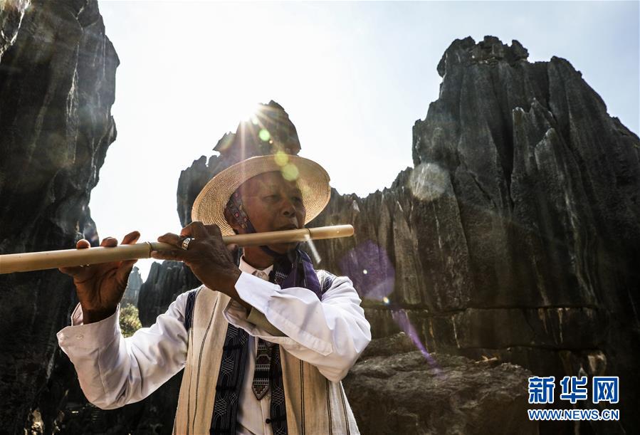 當(dāng)?shù)厣贁?shù)民族樂(lè)手在石林景區(qū)演奏民族音樂(lè)(11月27日攝)。新華社記者蘭紅光攝