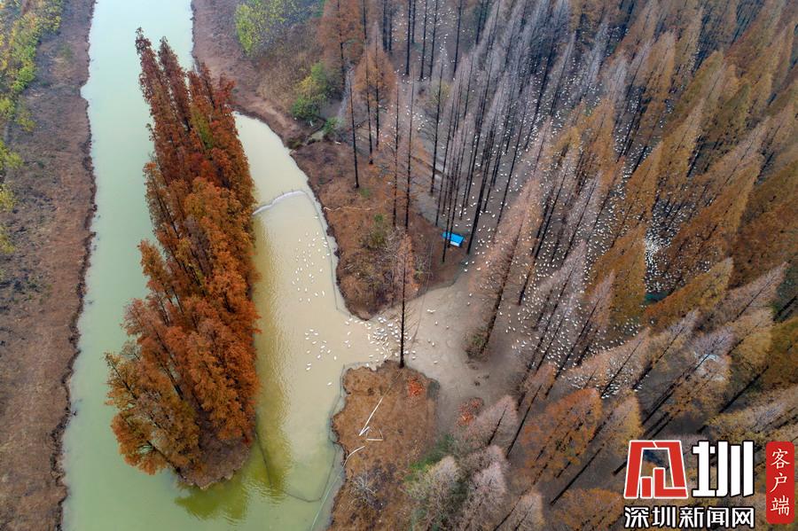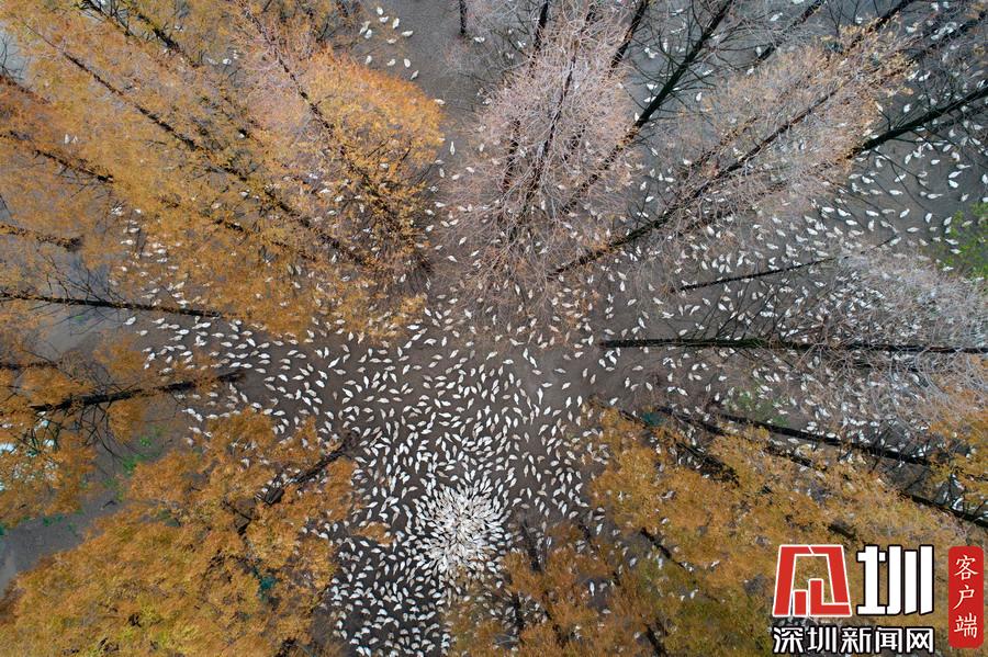 2019年12月1日,江蘇省宿遷市泗洪縣,航拍5000多只四季鵝在陳圩林場的樹林下吃食的壯觀場景。