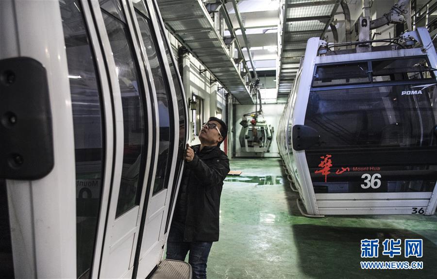 華山太華索道檢修人員在檢查吊廂門開(kāi)關(guān)(12月6日攝)。新華社記者陶明攝