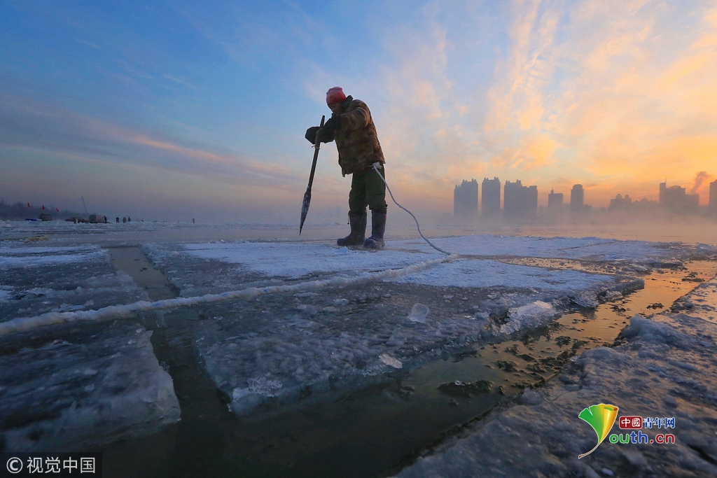 中國青年網(wǎng)2018年12月13日訊2018年12月11日,黑龍江省哈爾濱市,松花江上,采冰人在漫天霞光中破冰、采冰,金色光芒在水霧上升騰繚繞,給勞動(dòng)的場面增添了詩意。