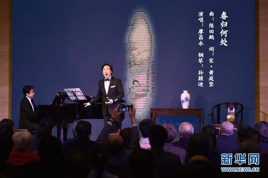 12月10日晚,廖昌永在音樂會(huì)上演唱《春歸何處》。 當(dāng)晚,中國古典詩詞與書畫——廖昌永中國藝術(shù)歌曲獨(dú)唱音樂會(huì)在北京中國美術(shù)館舉行。 新華社記者 魯鵬 攝
